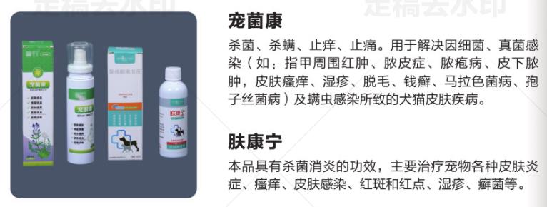 殺菌、殺螨、止癢、止痛。用于解決因細菌、真菌感染(如:指甲周圍紅腫、膿皮癥、膿皰病、皮下膿腫,皮膚瘙癢、濕疹、脫毛、錢癬、馬拉色菌病、孢子絲菌病)及螨蟲感染所致的犬貓皮膚疾病。