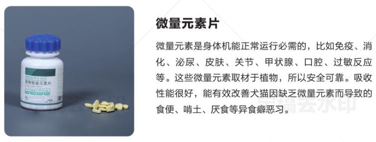 微量元素是身體機能正常運行必需的,比如免疫、消化、泌尿、皮膚、關節、甲狀腺、口腔、過敏反應等。這些微量元素取材于植物,所以安全可靠。吸收性能很好,能有效改善犬貓因缺乏微量元素而導致的食便、啃土、厭食等異食癖惡習。